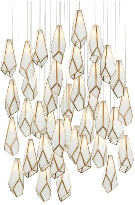 The faceted shades of the Glace White 36-Light Multi-Drop Pendant are made of panes of white art glass joined with seams of metal in an antique brass finish. The organic shape of the shades and the fact they hang at differing heights enhance the personality of this white pendant, which will ornament a space like a piece of jewelry.Read More