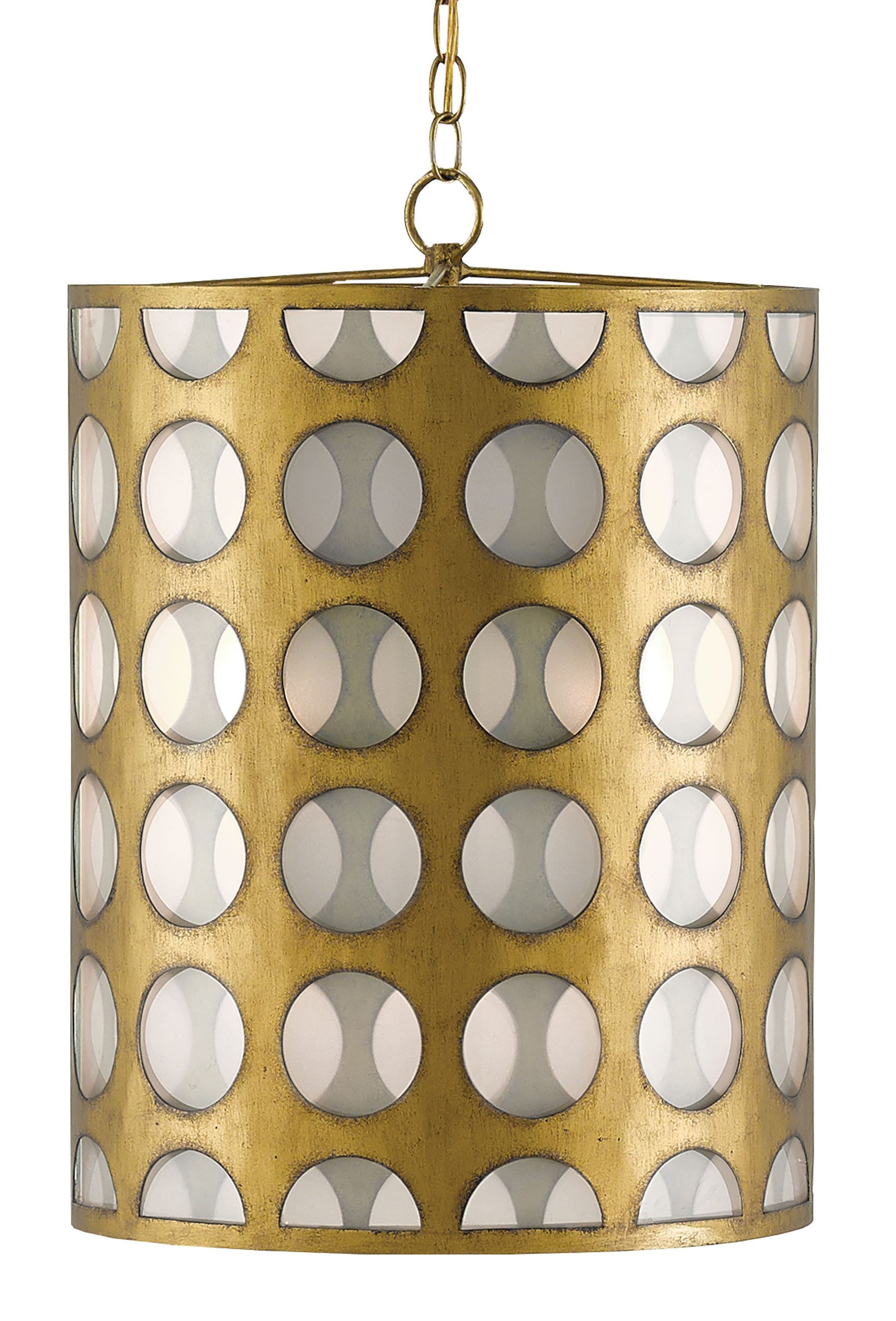 The Go-Go Pendant has a mid-century vibe with a shapely twist. The white opaque glass shade is slotted between two sheets of wrought iron in a brass finish. These off-set to create half-moon shapes within the row of circles on the gold pendant. We also offer the Go-Go in a flush-mount.Read More
