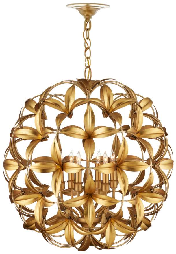 The Helenium Orb Chandelier is a whimsical nature-inspired piece made of wrought iron in a mix of contemporary gold leaf and contemporary gold finishes. Four flowers blossom from each tuft that is affixed to the frame in a steady flow of flourishes.Read More