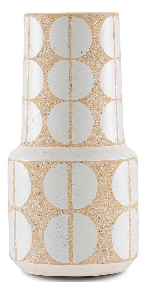 Fresh and on-trend, our collection of Happy Vases, which includes the Happy 60 Tiered Vase, is a reminder of the carefree times during the 1960s. The artistry employed to create these terracotta beige decorative vases is called a wax-resist technique. All of the surface areas that the artisan decides will be left unglazed are covered by wax so that the glazing material cannot give it the sheen that comes with it. Though the beige and white pattern is our nod to the ultra-60s, the shapes of the decorative accents have been modernized with cleaner lines.Read More