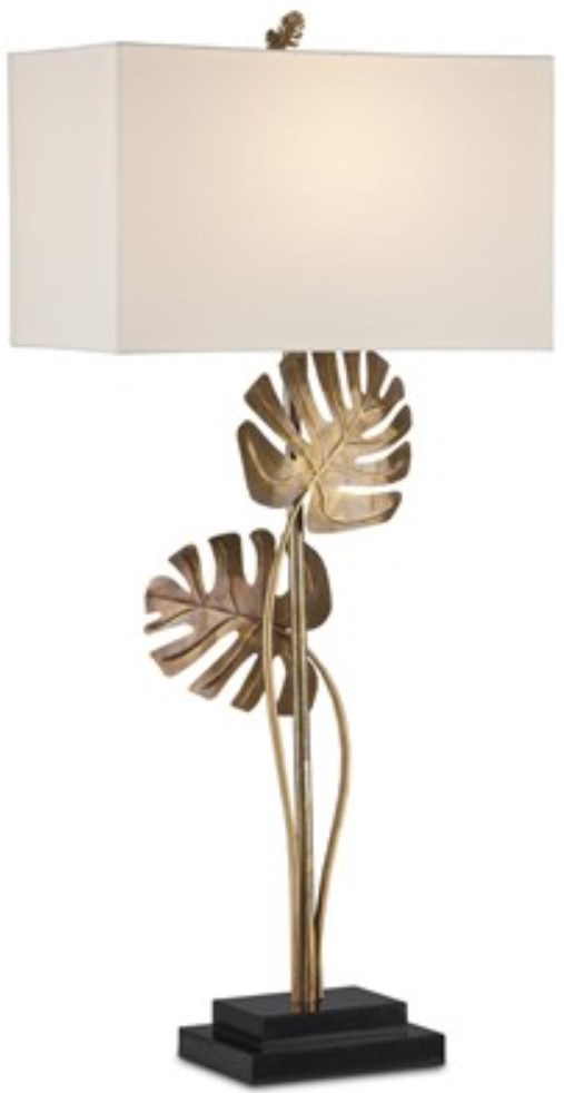 The console lamp has a stacked black granite base and is topped with an off-white linen shade that is fastened with a fanciful finial -- a petite version of the larger leaves on the lamp's body.