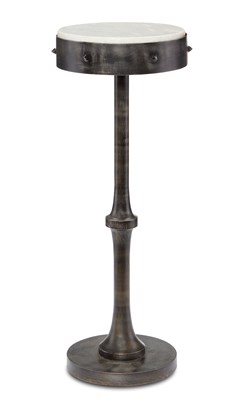 With a hint of industrial style, the Helios Drinks Table is made of iron in an antique black finish that brings the base, stem, and rim on the tabletop added patina. The design details are geometric—the fluted bulge on the stem and trumpet shape where it meets the base. The spikes on the top surround are reminiscent of medieval armory. We’ve topped the metal drinks table with a disc of white marble for a nice contrast, the black/white interplay a staple in modern farmhouse style.Read More