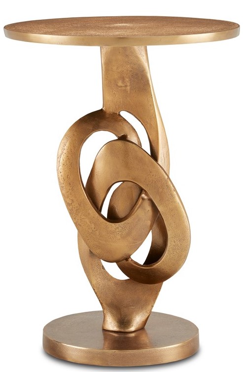 The Kadali Accent Table, made from cast aluminum in an antique brass finish, is a shape-shifter. Viewed from head-on, the motif that flows up from the base to bring its profile an artful fluidity looks like thick links in a slack chain.Read More