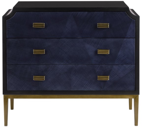 The Kallista Chest has a dark sapphire blue finish that enlivens the sycamore veneers on its door fronts. The wood grains bring the navy blue chest a hint of distressing that contrasts the sleek lines of the base and the door pulls in an antique brass finish.Read More
