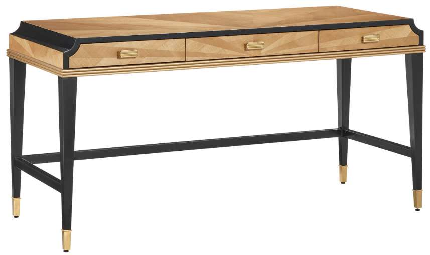 The legs and delineated details that run along the top edge of the front and sides of the desk are made of mahogany in a caviar black finish and the tailored ferrules are in a polished brass finish. Specialty treatments include wood drawer slides, a fully-finished back, and faux velvet drawer liners.