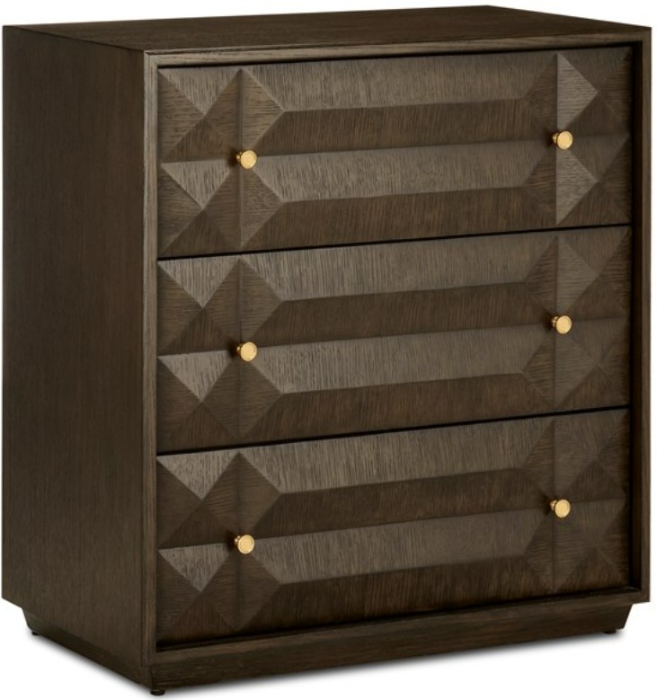 This faceted dark brown chest is jewel-like, and the metal pulls in a polished brass finish adding a glimmering touch to the warmth of the gem-like chest.