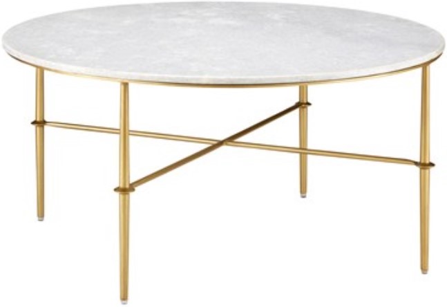 Made of iron in an antique brass finish, the gold cocktail table is topped with a disc of white marble that ups the ante on its sophistication. Introducing an enhanced sense of refinement are the circlet details where the stretchers clasp each of the four legs.