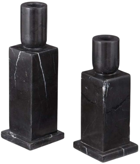 The Lithos Black Candle Holder Set includes two candle holders made of black marquina marble. The geometric shapes that comprise profile are enlivened by the natural veining of the stone, making each one unique. The characteristics of this stone bring a deep black and crisp white interplay to their surfaces.Read More