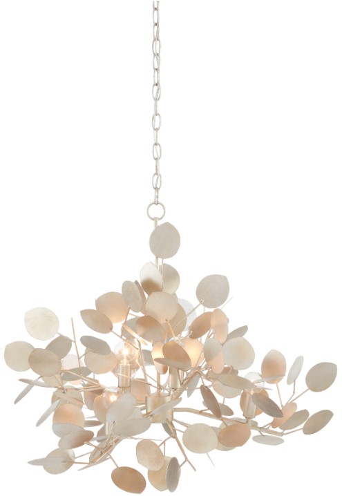 With a lyrical profile of fluttering discs that favor the leaves of its namesake plant, the Lunaria Chandelier is made of wrought iron in a contemporary silver leaf finish. The bulbs that are sprinkled amongst the flowing petals of metal reflect off the finish on this silver chandelier to increase the glow.Read More