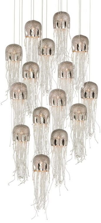 The Medusa Round 15-Light Multi-Drop Pendant effervesces with echoes of the deep sea. Beads cascading from its dimpled shades in a nickel finish mimic the profile of a jellyfish, one of nature’s most mysterious creatures.Read More