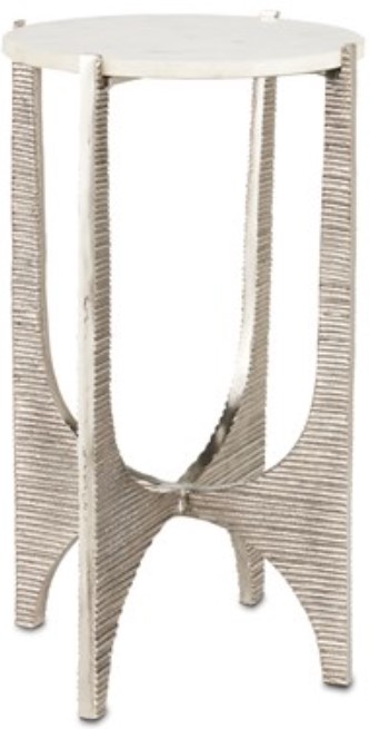 The silver accent table holds the white stone top as brilliantly as it shines, the removable disc fitted with felt pads on the bottom. The way the upper and lower u-shaped negative spaces intersect introduces added character to the design.