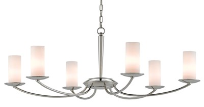 The Myles Chandelier embodies one of the most classic shapes known to suspension fixtures: a spoking frame, made of cast brass, that reaches out from its center. Finished in a cool polished nickel, the silver chandelier has a subtle mid-century vibe thanks to its six narrow milk-glass shades.Read More