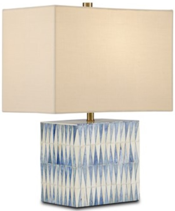 The Nadene Blue & White Table Lamp is a decorative table lamp made of alternating colors of bone. The jagged pattern is created when blue and ivory bone are hand-applied to the surface, which makes the blue table lamp an artisanal accent that packs a textural punch.Read More