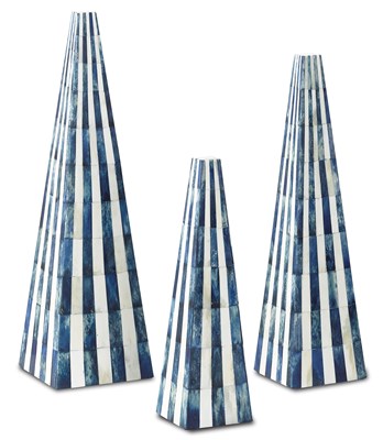 Simplifying the classically formal shape of the obelisk and embellishing it with bone makes the Ossian Blue Obelisk Set minimalist in style. Covered in white and blue bone, these blue sculptures are bolder than the Ossian White Obelisk Set.Read More