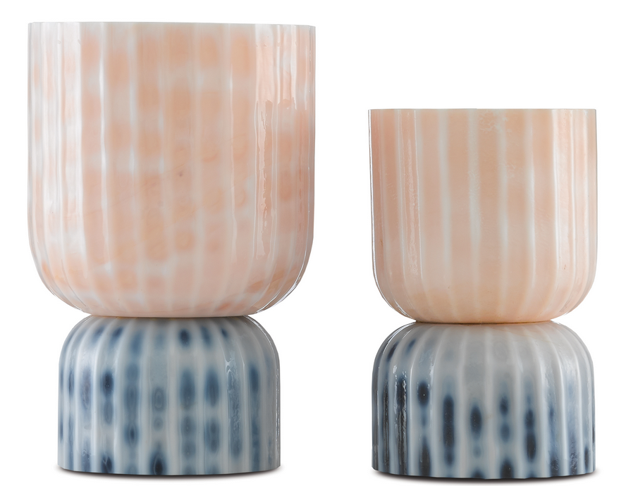 Our Palazzo Milky Glass Vases, which come in a set of two, are mouth-blown in a glossy, milky glass with a texture that has a rich marbleized sheen. The pink upper vase perches on a blue base, which is blown separately and then heated so it fuses to the bottom vessel. These beautiful pink and blue vases read as if they could have been created during the 1940s.Read More