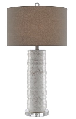 The treatment on the ceramic body of the Pila Table Lamp is a painterly technique that makes the ivory and taupe patterns resemble stone. Sitting atop an optic crystal base, the white lamp has a lovely oversized gray linen barrel shade fastened in place with an optic crystal finial.Read More