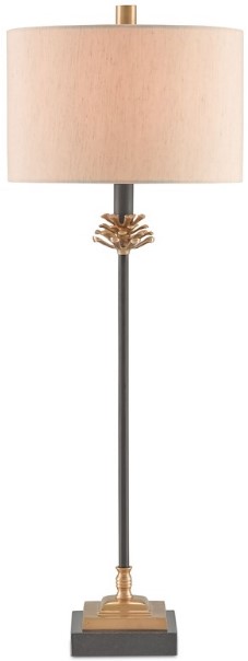 The Pinegrove Table Lamp has a black wrought iron column that extends between a spreading pinecone accent in an antique brass finish and a stacked base in brass and black granite. The beige poplin shade on the dark gray lamp is fastened by a finial in an antique brass finish.Read More