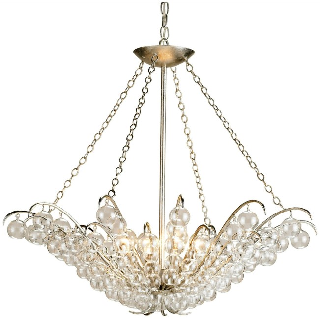 The striking Stratosphere Chandelier makes a brilliant statement, both in size and in the allure reflected by its ethereal elements. Blown glass balls gleam with reflected light as they circle down the simple wrought iron frame. Adding to the sheen of the silver pendant is a contemporary silver leaf finish.Read More
