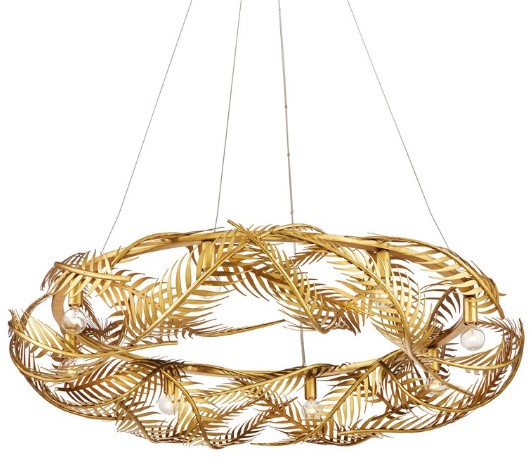 In the Aviva Stanoff Collection, the Queenbee Palm Ring Chandelier pays homage to the graceful movement of palm leaves blowing in the wind. The fronds, finished in a mix of contemporary gold leaf and painted contemporary gold finishes, curl gracefully around the circular frame of the fixture.Read More
