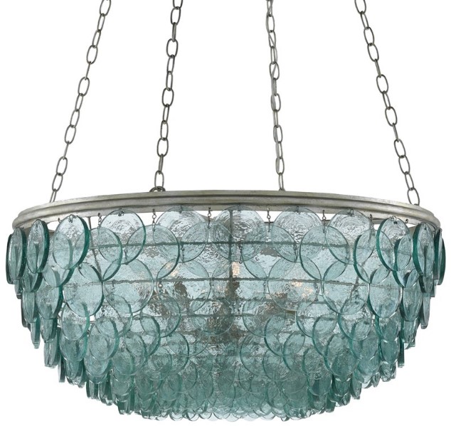 Recycled glass discs dangle from the wrought iron frame of the Quorum Small Chandelier. These overlap to form a textural shade that turns the light emanating through the glass into a mottled mosaic. The frame in a silver leaf finish anchors the turquoise glass chandelier. We also offer the Quorum in a large chandelier.Read More