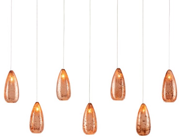The Rame Rectangular 7-Light Multi-Drop Pendant has teardrop-shaped shades made of mercury glass with silver on the inside and copper on the outside. The personality of the patterns on the glass is evident whether the lights are switched on or not, though when illumination brightens the shades, the effect is dazzling.Read More