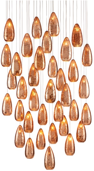The Rame 36-Light Multi-Drop Pendant has a teardrop-shaped shade made of mercury glass with silver on the inside and copper on the outside. The personality of the patterns on the glass is evident whether the lights are switched on or not but when illumination brightens the shade, the effect is dazzling.Read More