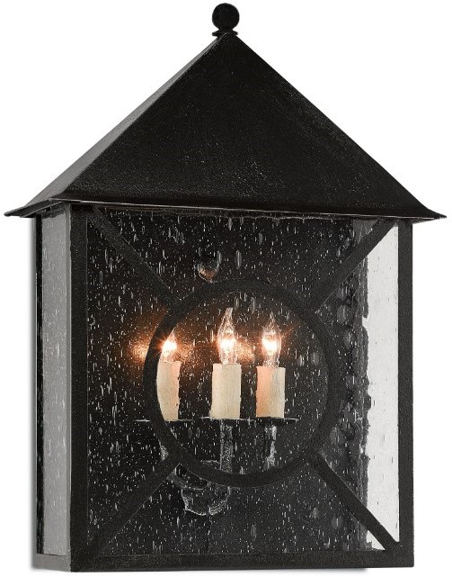 The metal on this black sconce in a midnight finish surrounds seeded-glass panes. We also offer the Ripley in medium and small wall sconces, and as hanging lanterns and post lights.