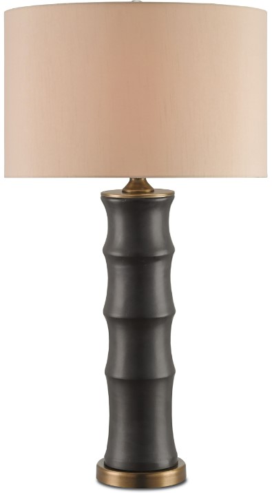 The Roark Table Lamp is made of ceramic to imitate the shape of a stalk of bamboo. The matte black finish on the column anchors the lamp, which glints when light strikes the antique brass hardware and base. The black lamp is topped with gold shantung shade that echoes the tones in the metal.Read More