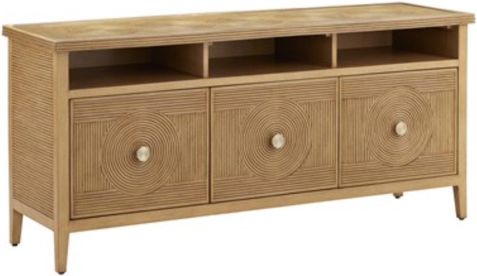 The Santos Sea Sand Rectangular Cabinet has a split rattan pattern on the doors, sides, and top, which is made by hand and applied to a solid mahogany frame. Then a Sea Sand finish is applied to the entire piece.Read More