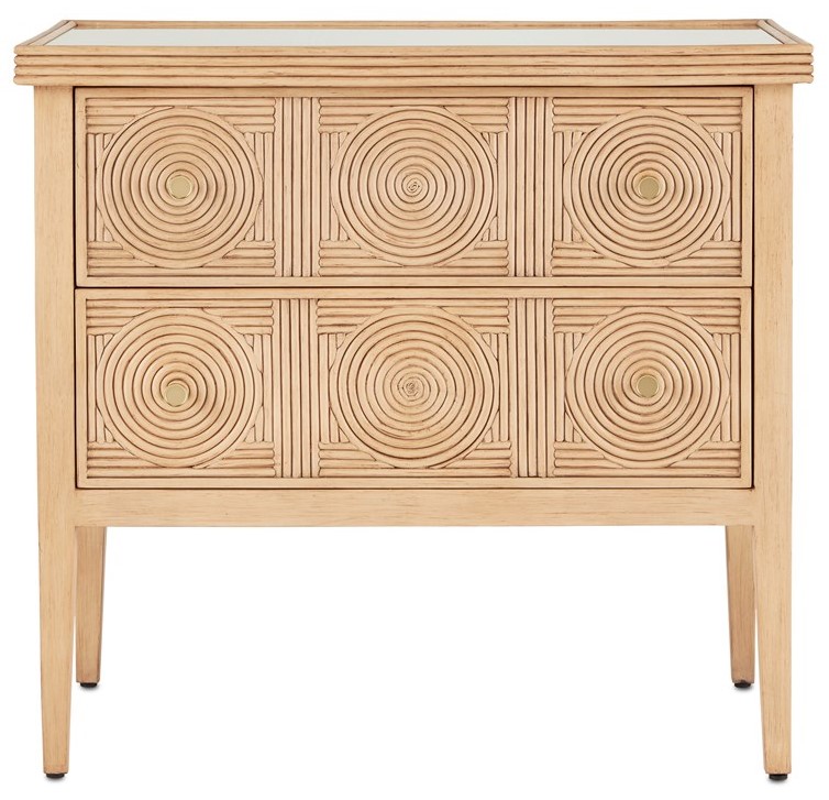 The Santos Chest has a split rattan pattern on the drawers and the top, which is made by hand and applied to a solid mahogany frame. Then a Sea Sand on Rattan finish is applied to the entire piece. A design detail of note is how the brass pulls sit squarely in the center of the outer circles created by the pattern. This tan chest has solid mahogany dovetail drawer boxes, soft close drawer slides, and adjustable glides.Read More