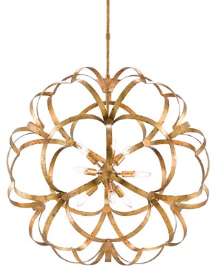 The Sappho Orb Chandelier is made of ribbons of wrought iron fluttering around its nine lights. This is a fixture that illustrates the talent of our craftspeople who can make such a rigid material feel graceful. Once it reached its final form, the gold chandelier was finished in a new gold leaf to make it shine.Read More