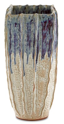The Sea Horizon Large Vase is an ivory vase onto which blue and purple glazes have been dripped. The main finish is a milky white hue with a tinge of cream to it. One of the unique characteristics of its fluted shape is how the ridges that jut out from the surface look as if they have been pinched in place. We also offer the Sea Horizon as a medium vase.Read More