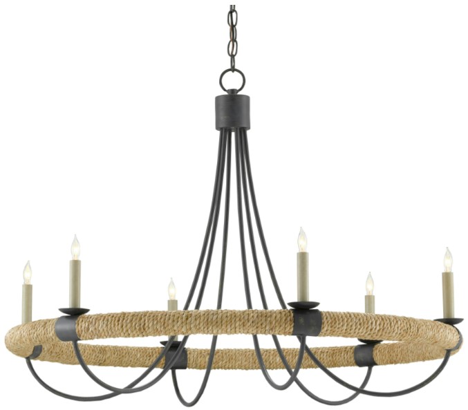 Made of wrought iron in a mix of French black and smokewood finishes, the rope chandelier is decidedly sea-side worthy but it also checks the box on modern farmhouse style.