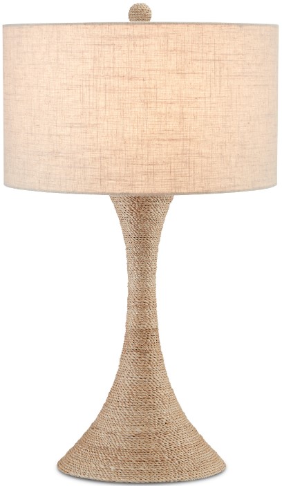 The natural linen shade has a coarse texture that seamlessly echoes the character of the abaca on the rope lamp’s body and ball finial.