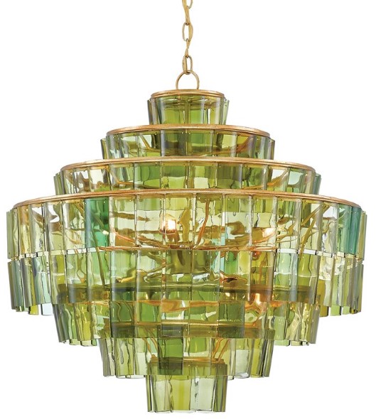 The distinctive green hues of the recycled wine bottles used to make the Sommelier Chandelier bring this fixture its feeling of luminosity. Natural uneven textures on the hanging glass pieces affixed to the green chandelier are accentuated by a dark contemporary gold leaf finish. We also offer the Sommelier in white glass.Read More