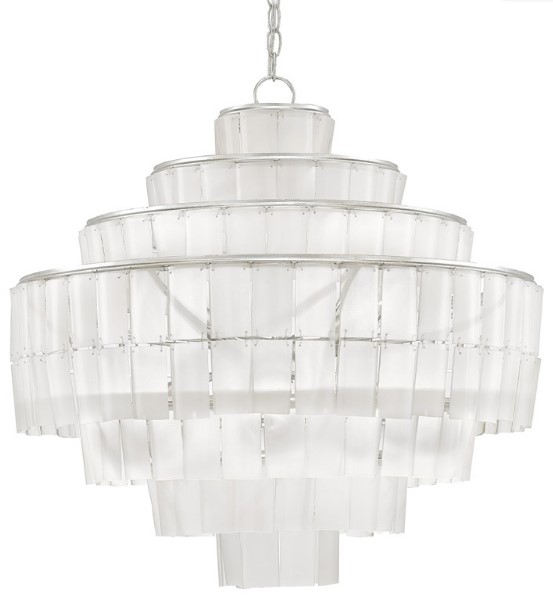 The distinctive white hues of the recycled glass used to make the Sommelier Blanc Chandelier bring this fixture its feeling of luminosity. Natural uneven textures on the hanging glass pieces affixed to the white chandelier are accentuated by a contemporary silver leaf finish. We also offer the Sommelier in green glass.Read More