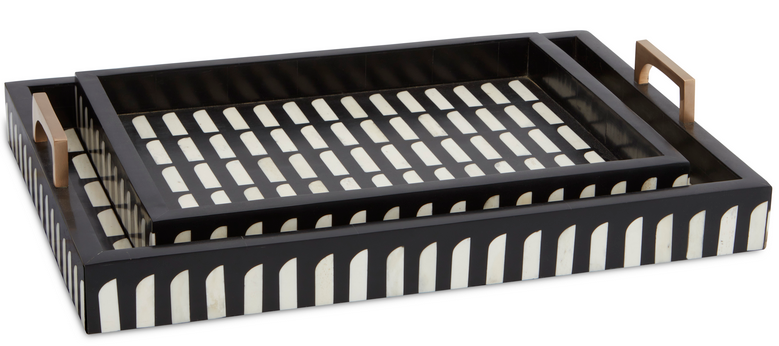 The Swoop Tray Set, designed by Jamie Beckwith, is based on a strong graphic shape that comes alive with the contrasting of pieces of bone and composite in ivory and black along the surface. Originally created in bold patterns for vertical and horizontal surfaces, Beckwith says of the Swoop, “I was inspired by mid-century design, specifically Italian designer Gio Ponti, when creating the Swoop pattern. I especially like the idea of curves with straight lines found in Swoop. There is a feminine but masculine feeling to these designs which work well in many environments, and that is due specifically to the shape.” We have a number of offerings in the Swoop family of products.Read More