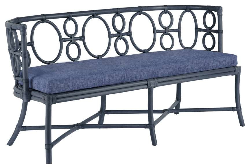The natural material has a vintage navy finish that adds warmth to the blue bench with a cushion covered in a Finn Indigo fabric.