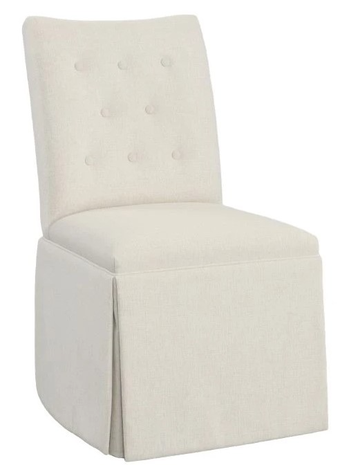 Elevate your dining room setup with this Concave Back Skirted Dining Side Chair from Fairfield. This armless chair features a button tufted back design and available in variety of finish and upholstery, this will elevate the look of your space.Read More