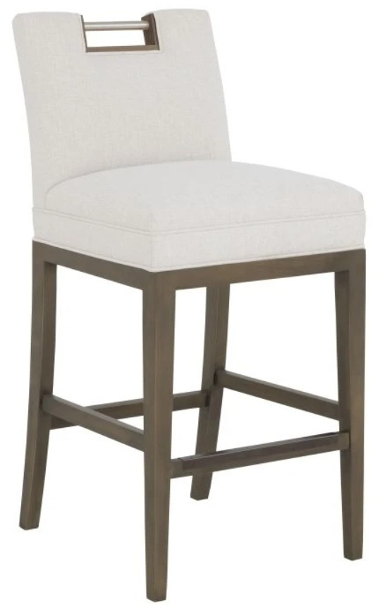 This elegant, customizable bar stool features a tight upholstered seat and smooth, short back, anchored by a solid rubberwood frame. Accented with a nickel metal pull handle at the back, it blends refined styling and durability in one polished piece.Read More