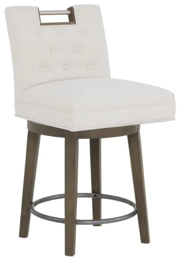 This elegant, customizable swivel counter stool features a tight upholstered seat and smooth, short back, anchored by a solid rubberwood frame. Accented with a nickel metal pull handle at the back, it blends refined styling and durability in one polished piece.Read More