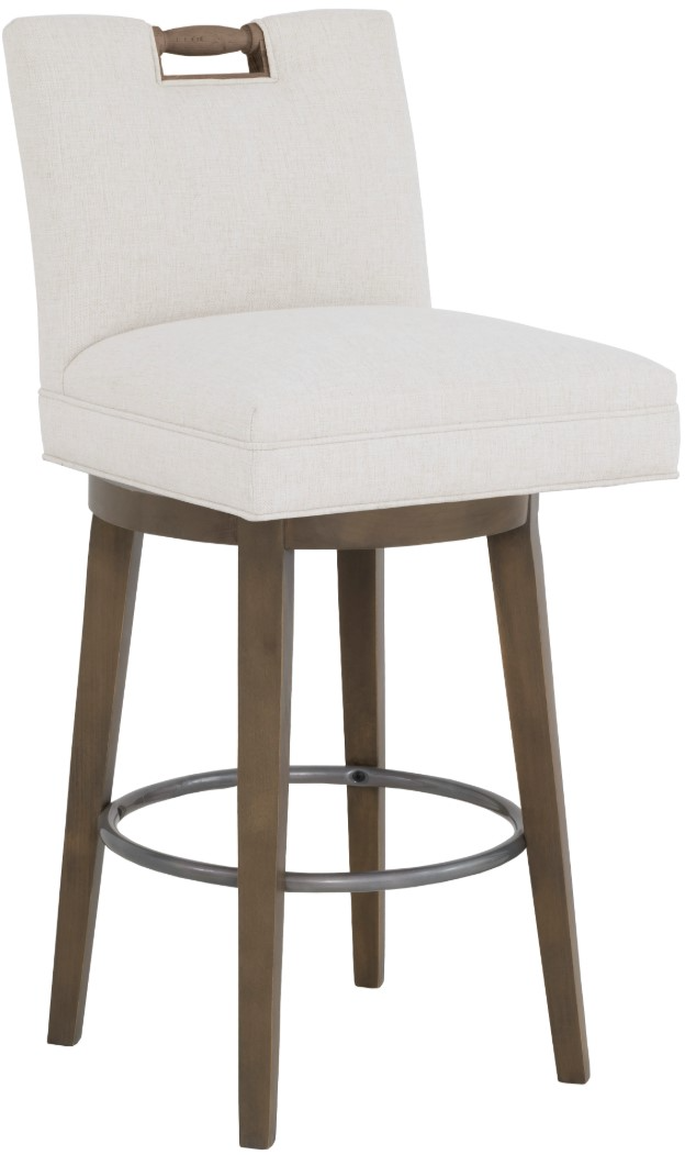 Blending comfort and elegance, this bar stool features a gently curved short back, solid wood frame, upholstered seat with a swivel motion. Its signature pull-back handle adds ease of movement, while customizable finishes and optional nailhead trim offer refined versatility for any space.Read More