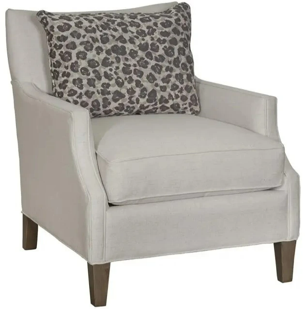 This transitional lounge chair has a loose back pillow resting on a scoop shaped upholstered back. The slim track arms are outlined with welting. The wood legs have a tapered shape.Read More