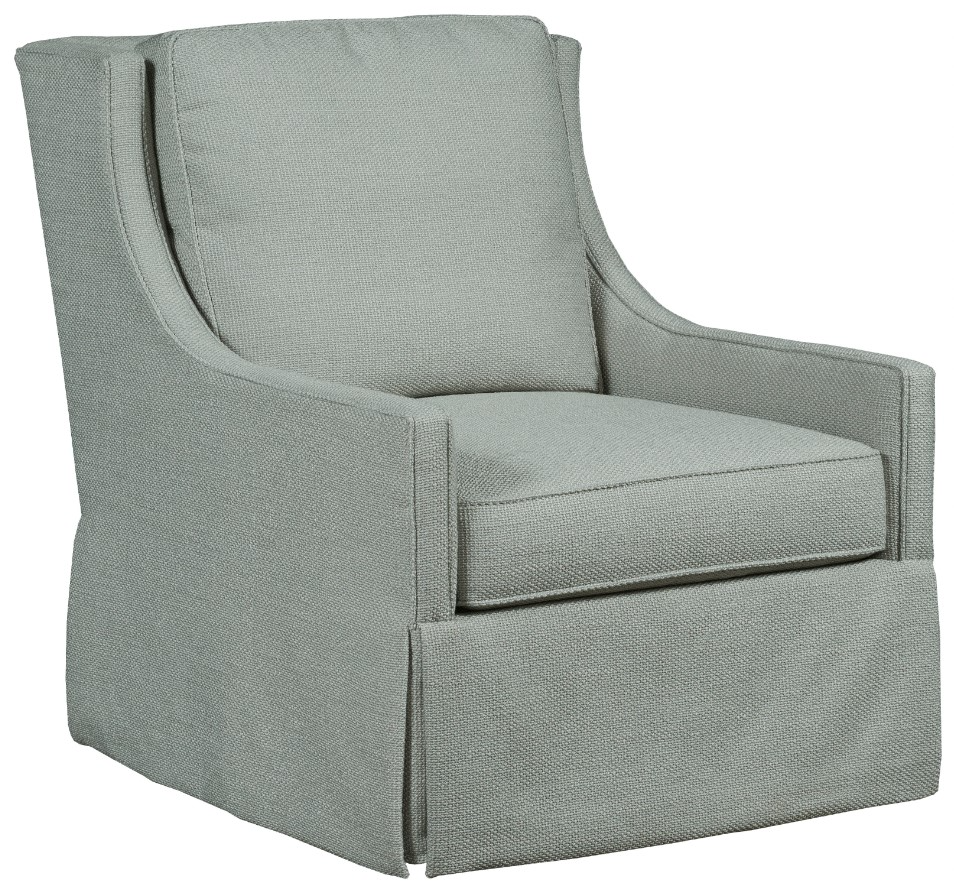 This comfortable swivel gliding lounge chair has a soft back between modified wings that flow into slim arms. The waterfall skirt gives casual transitional styling. Make a bold statement by incorporating this swivel glider into your home.Read More