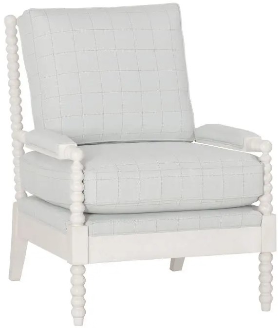 This unique lounge chair features exposed wood with spool carving for the entire outside back, the arms and the front legs. The loose back and seat cushion are plush and comfortable.