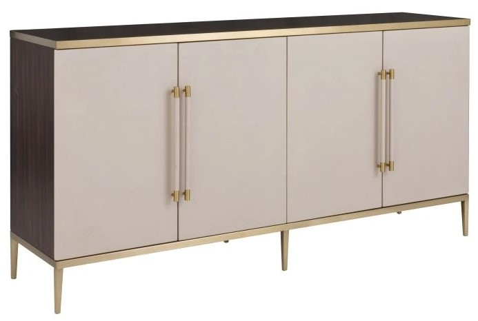 Hempstead Four Door Cabinet is a sleek and chic embellished storage piece finished in richly textured, in putty shagreen vinyl. The delicately tapered leg shape is highlighted by warm brushed brass details, shagreen wrapped door handles are elongated and oversized with brass tips.Read More