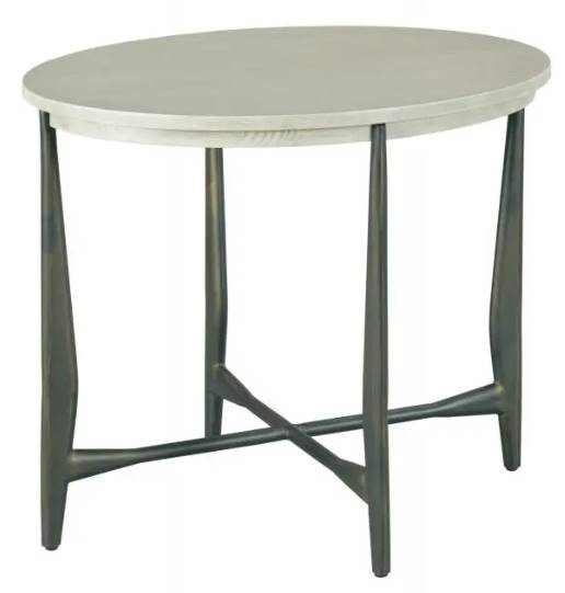 Oval wood top finished in sheer dove with a curved, metal base in dark bronze.