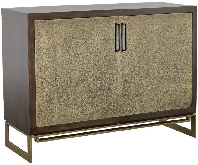 The Bronx chest features pebbled and antiqued gold leaf door fronts creating an hombre of color and texture. Contrasting finished mango solids add a twist to this decorative chest. A gold leaf finished metal base adds decoration and stability to this drawer chest.