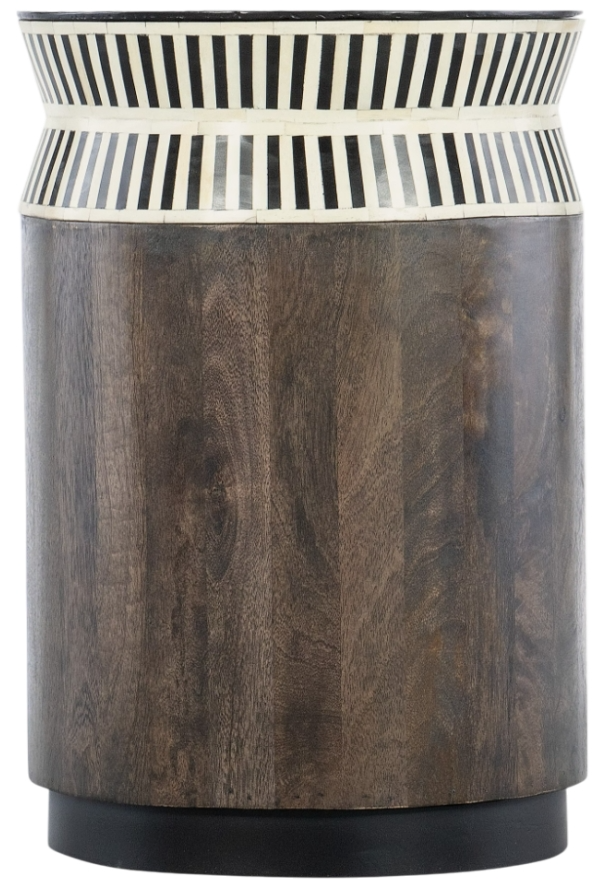 The tribal vibe of the Jacob’s ladder end table will add a staccato touch to your interiors. The compact 16-inch-round silhouette has a concave shape with bone inlay on the top two sections and a plinth base. Crafted of mango solids, bone and iron, it has a natural dark wood finish.Read More