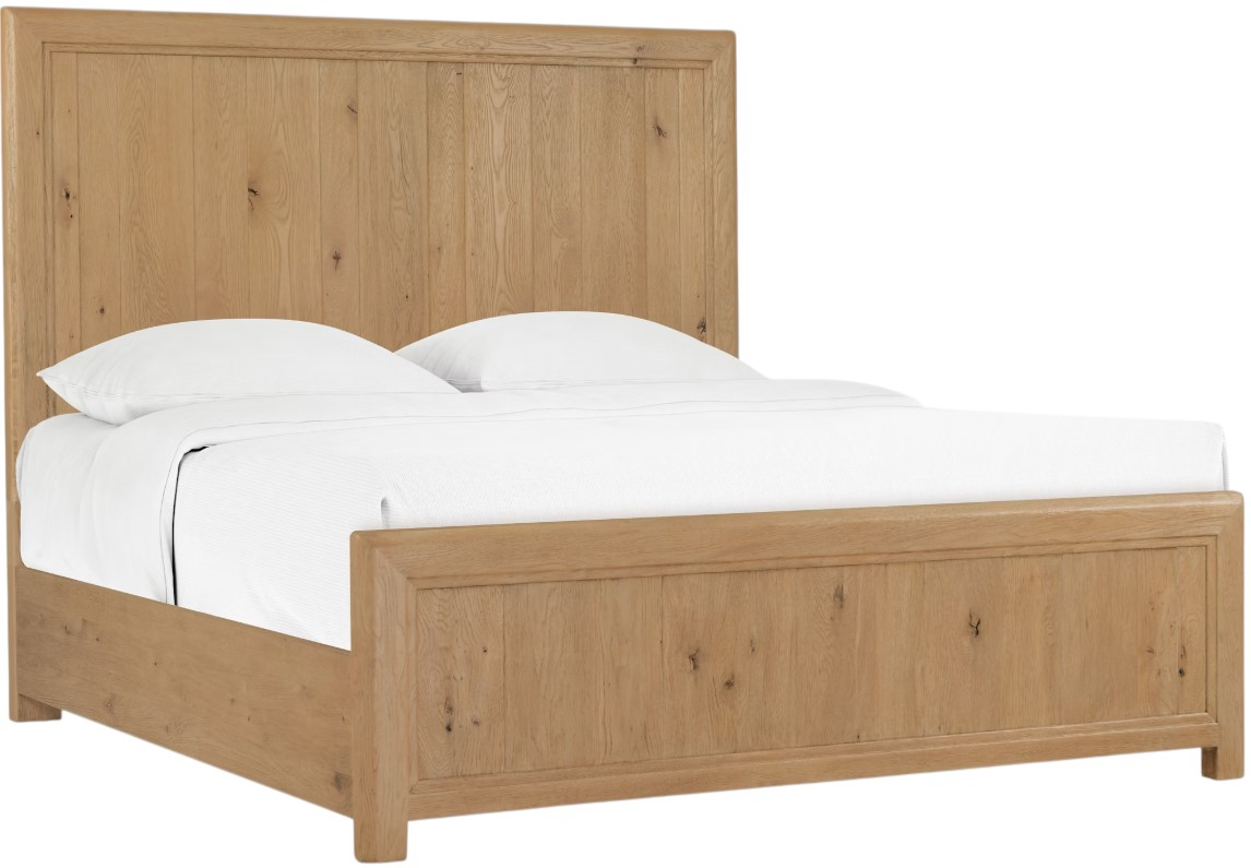 This Buckboard California King bed is crafted from oak solids and veneers, featuring a spacious frame with a warm, sun-faded oak finish. Includes headboard, footboard, and rails. Striking a balance between heritage craftsmanship and contemporary versatility, where history and refinement are woven into every detail.Read More